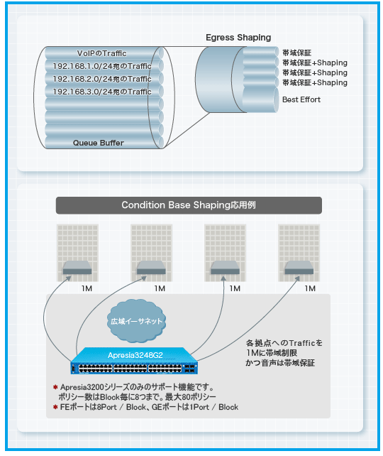 パケットフィルター機能と連動し、細やかなShaping(帯域制限)&Guarantee(帯域保証)が可能