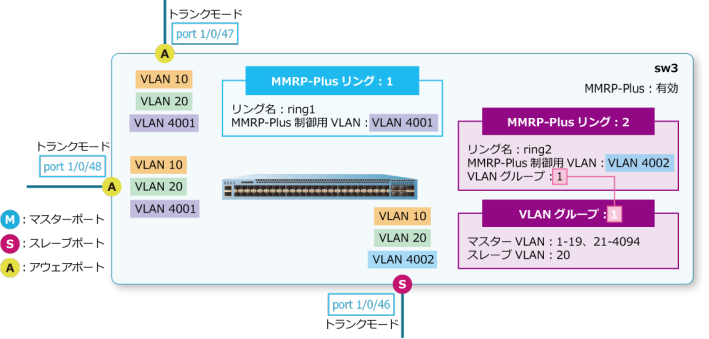 シングルマスター構成でVLAN分散を使用する場合の構成例と設定例を示します。なお、本設定例ではsw3の設定は省略します。