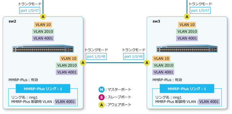 - アウェアポートを[ポート1/0/47, ポート1/0/48]指定で、sw2をリングID[1]のアウェア装置に設定します。