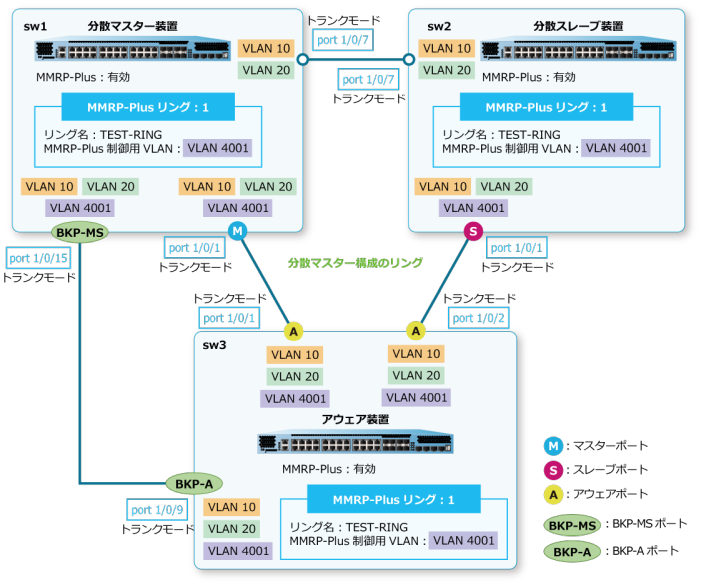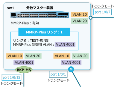 - sw1が分散マスター装置:マスターポート1/0/1、BKP-MSポート1/0/15