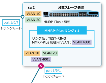 - sw2が分散スレーブ装置:スレーブポート1/0/1