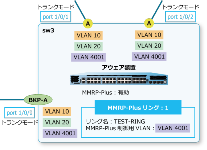 - sw3がアウェア装置:アウェアポート1/0/1,1/0/2、BKP-Aポート1/0/9