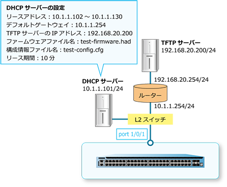 構成情報のみを対象としてZTPを動作させる場合の構成例と動作例を以下に示します。この例では、DHCPサーバー(10.1.1.254)を同一セグメントに、TFTPサーバーを別セグメント(192.168.20.200)に配置しています。