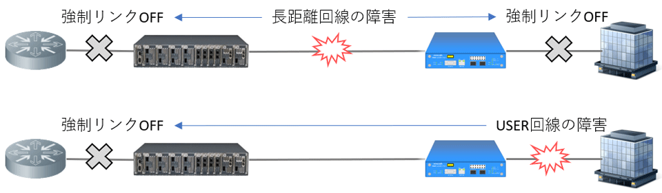 FLR(リンクステータス中継機能)は、回線に障害が発生したとき、自動的に対応するUSERポートのリンクをOFFし、素早く接続機器(スイッチングハブ・ルーターなど)に伝送路の障害発生を伝達する機能です。